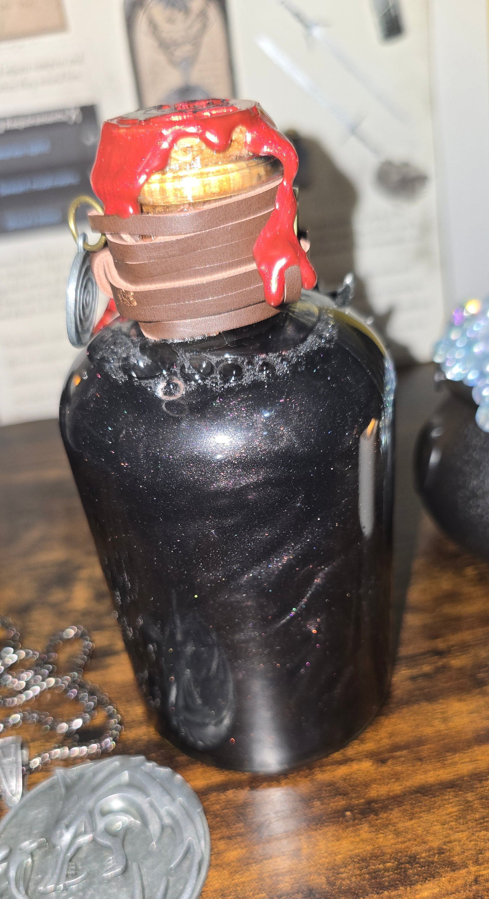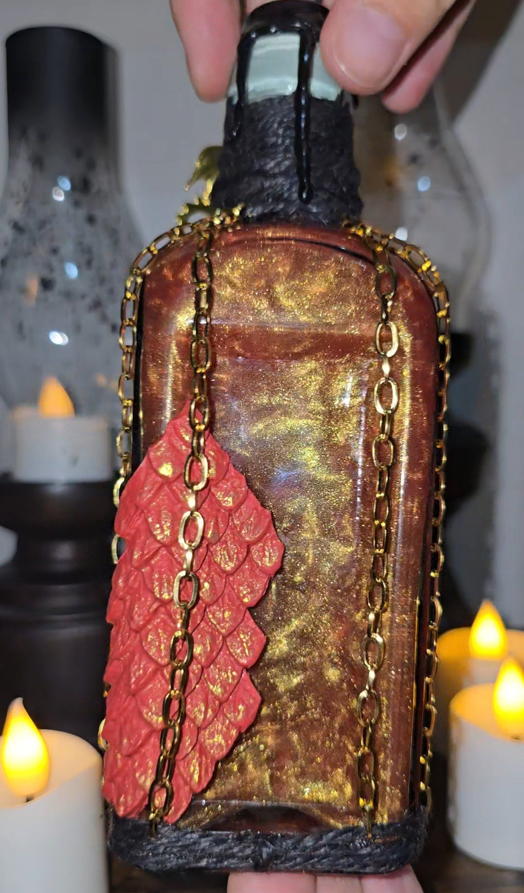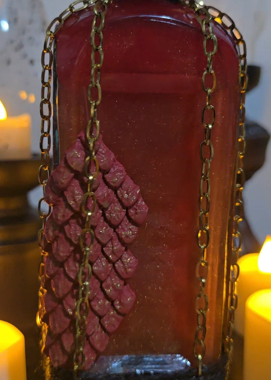 The bottle design is rich in detail — the deep red color gives it an otherworldly, mystical aura, and the gold dragon charm wrapped around the neck adds an extra touch of mythical luxury. The wax seal on the top looks beautifully authentic, as though it’s sealing away some ancient potion or dragon’s essence. The gold chain accent is a nice finishing touch that enhances the fantasy theme without looking gaudy. The little dragon scale detail on the front is especially eye-catching — it gives the bottle a tactile, handcrafted charm.