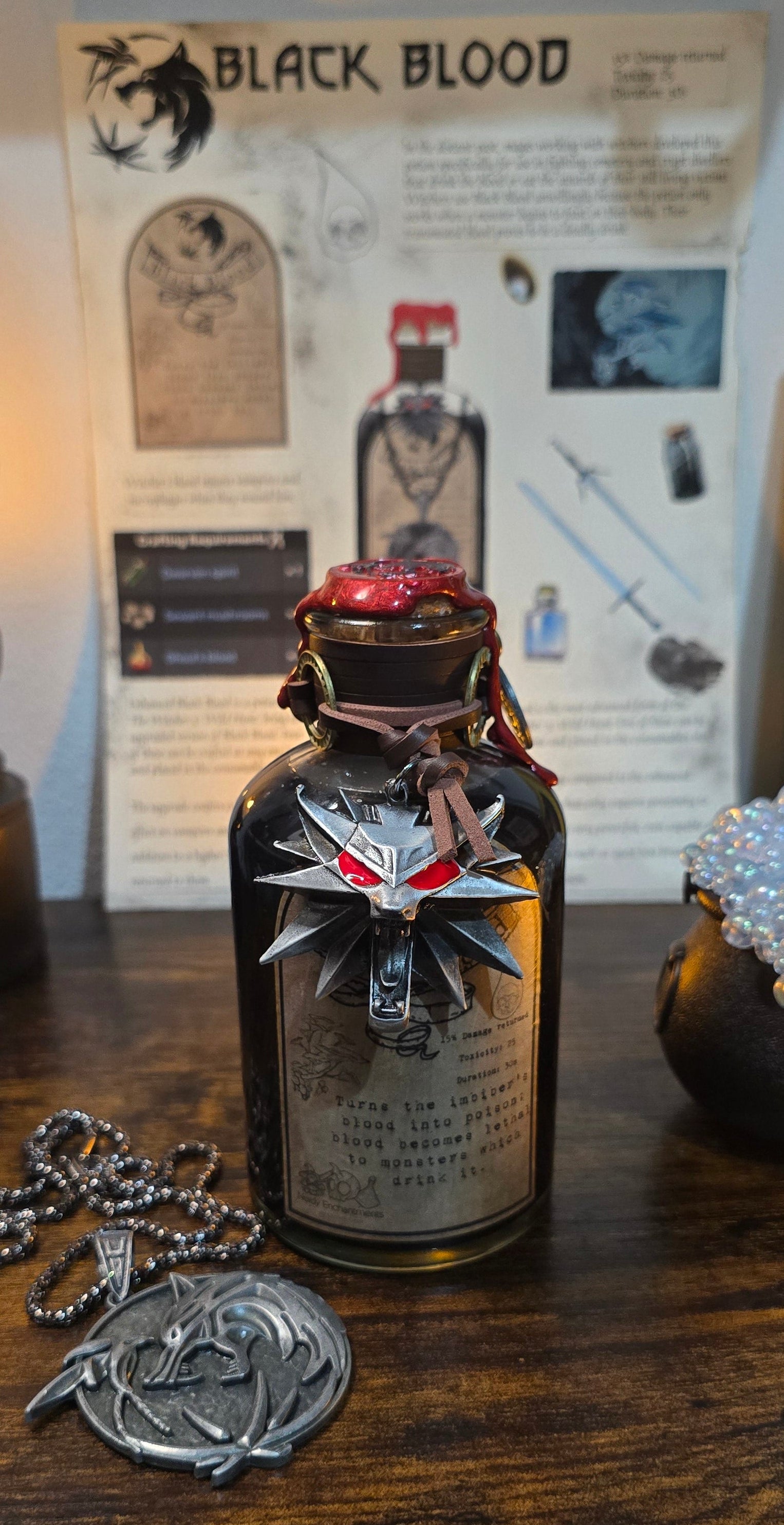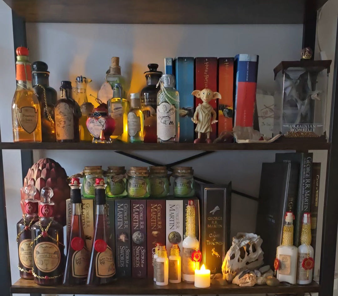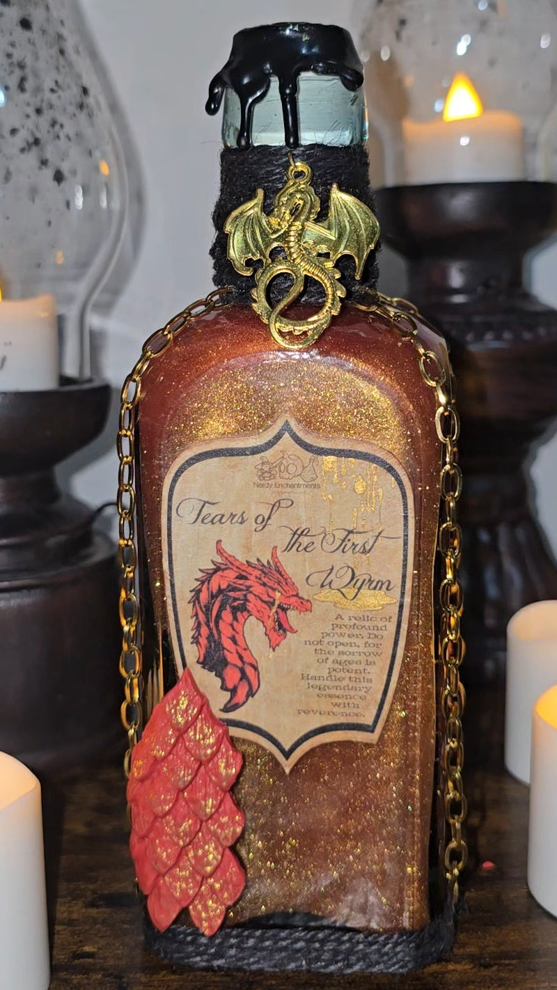 The “Tears of the First Wyrm” bottle is an absolutely stunning piece for anyone who loves fantasy décor, dragons, or medieval-inspired items. From the moment you see it, it feels like something straight out of a dragon keeper’s alchemy lab or a wizard’s study.