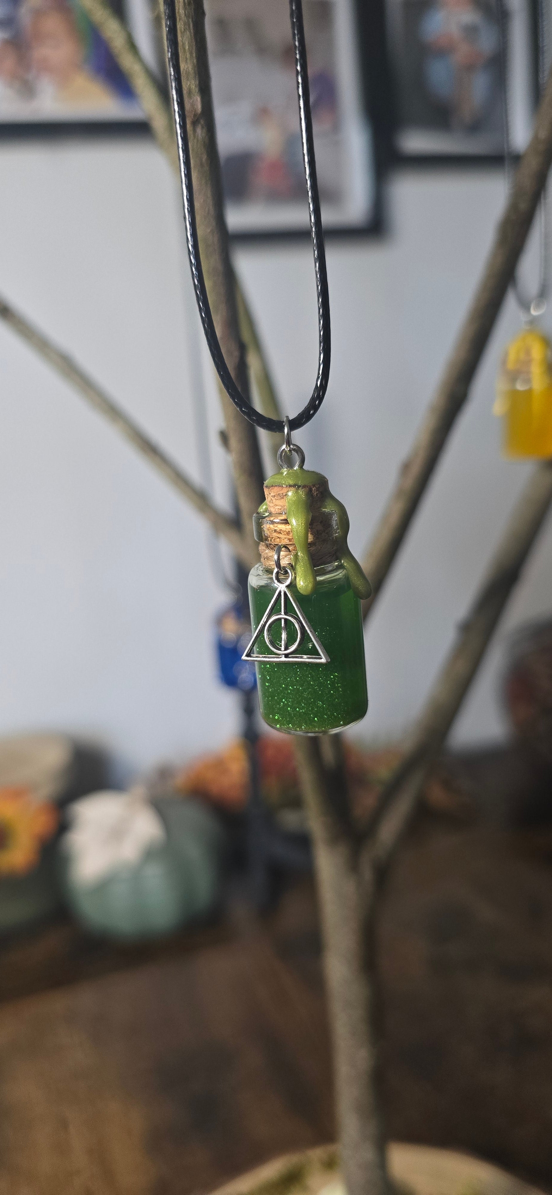 Declare your allegiance to your house with this exquisite potion bottle necklace! This delicate charm features a tiny bottle brimming with a vibrant, sparkling concoction in your house's signature colors. It's the perfect way to subtly display your Gryffindor courage, Hufflepuff loyalty, Ravenclaw wit, or Slytherin ambition.