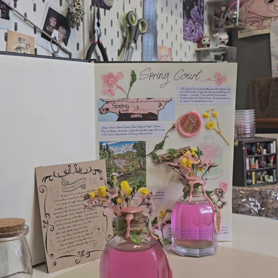 This decorative bottle captures the very spirit of Tamlin's realm, filled with a pink liquid that swirls with emerald green shimmer, mimicking flowers dancing through a forest. Instead of a label, it comes with a beautifully designed description card that tells the tale of its Spring Court origins. The bottle is elegantly sealed with a cork and jute twine, then adorned with delicate dried flowers and an antique-style wax seal, giving it an authentic, ancient apothecary charm.