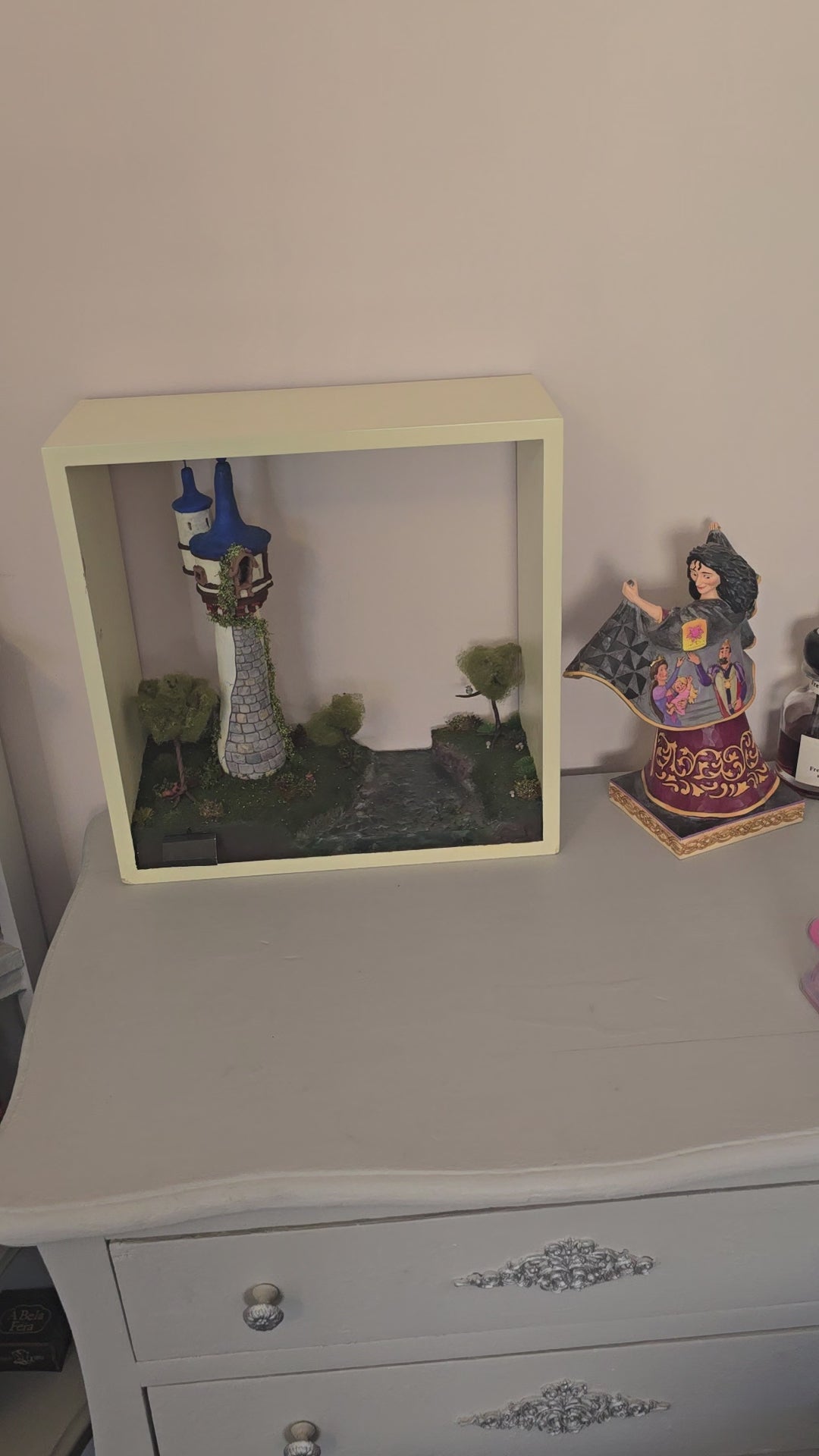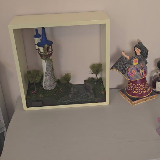 Bring the pages of a fairytale to your wall with our charming Tangled Rapunzel's Tower diorama, beautifully displayed within a box wall shelf. This whimsical creation captures the magic of Rapunzel's enchanting world, adding a delightful sparkle and storytelling wonder to any space. It's truly a piece that lets your imagination soar!